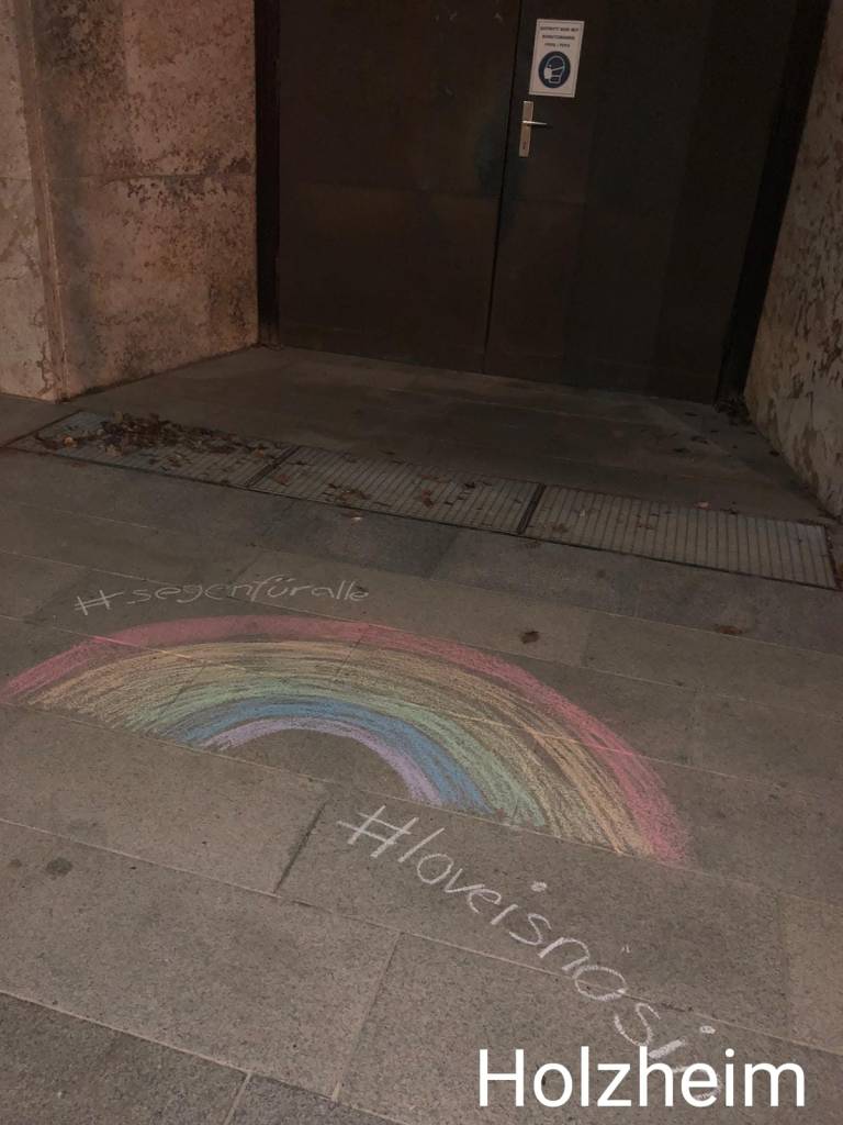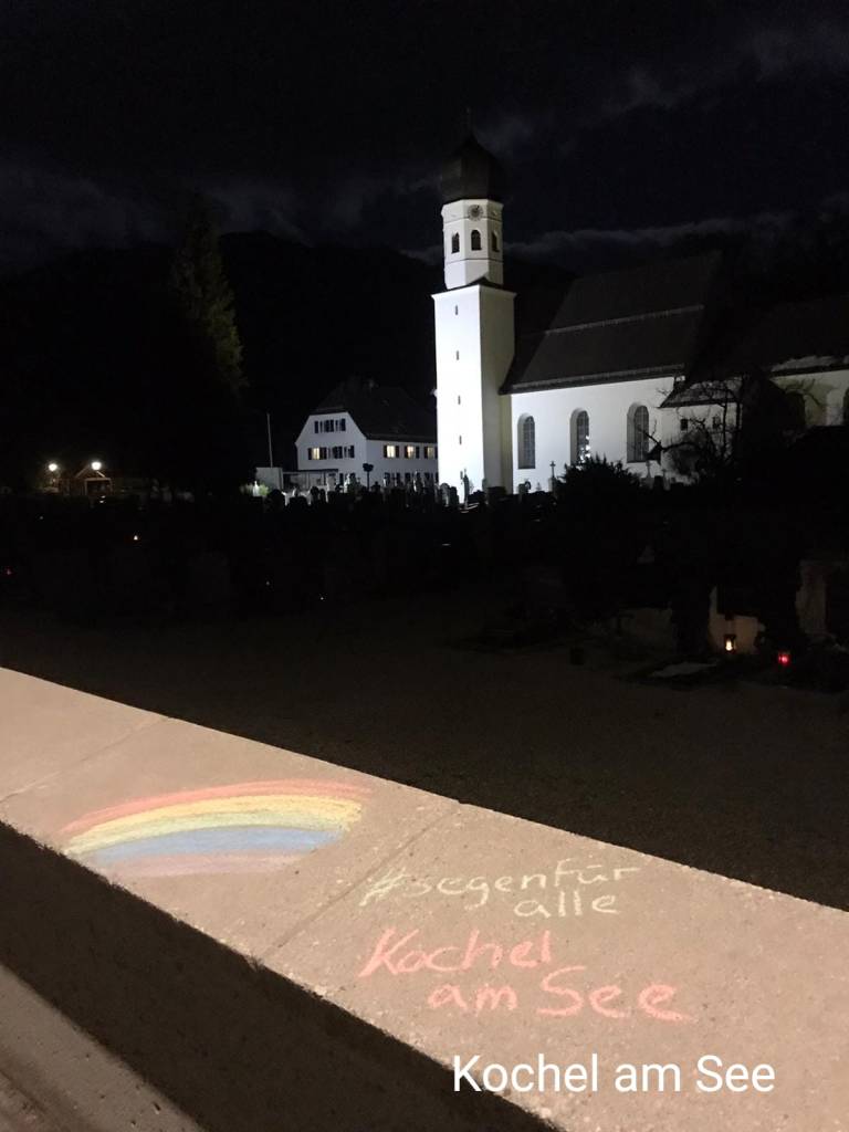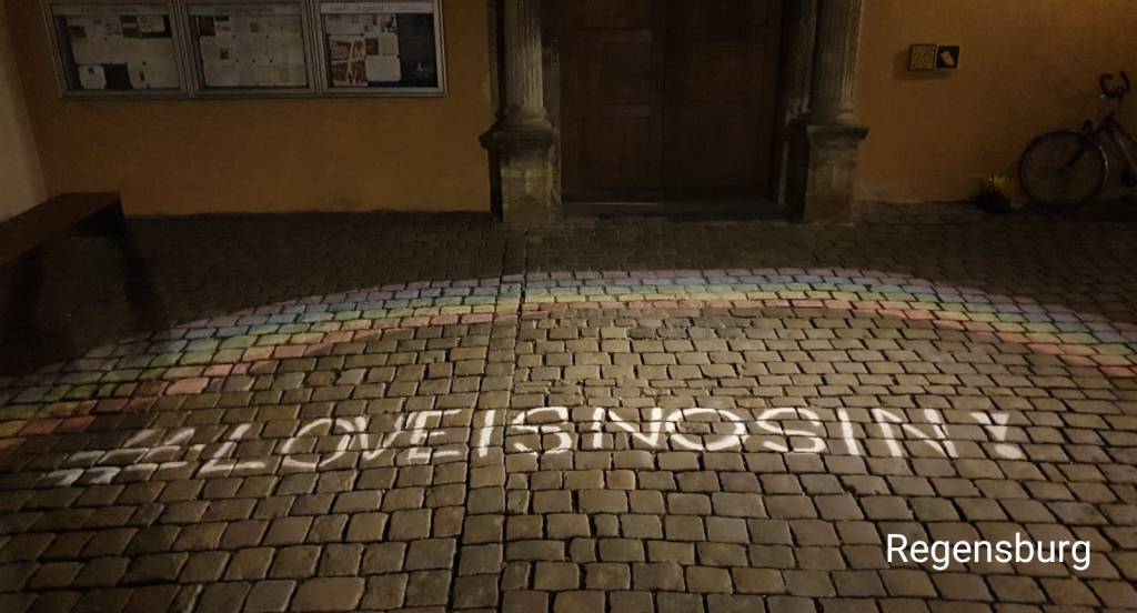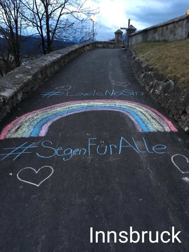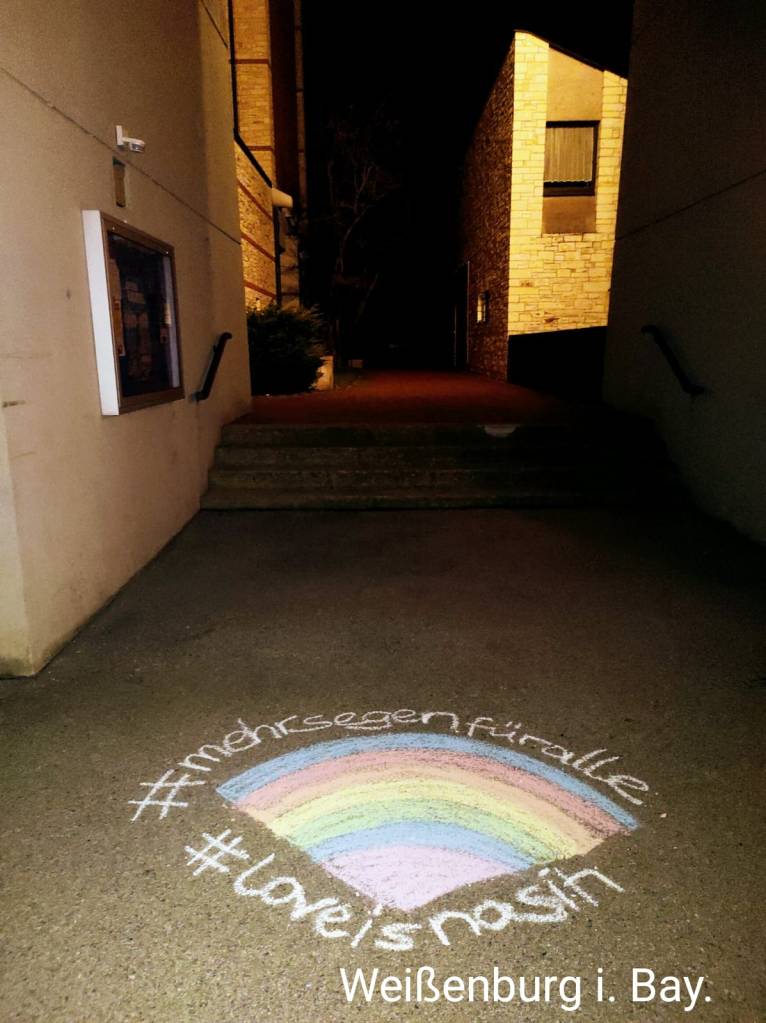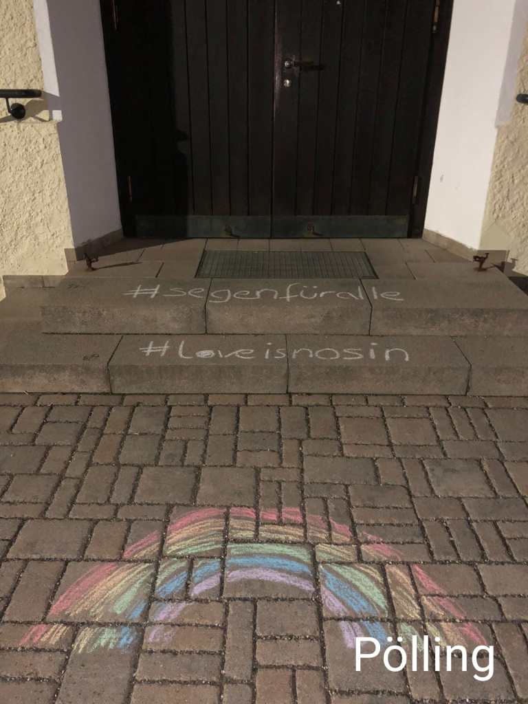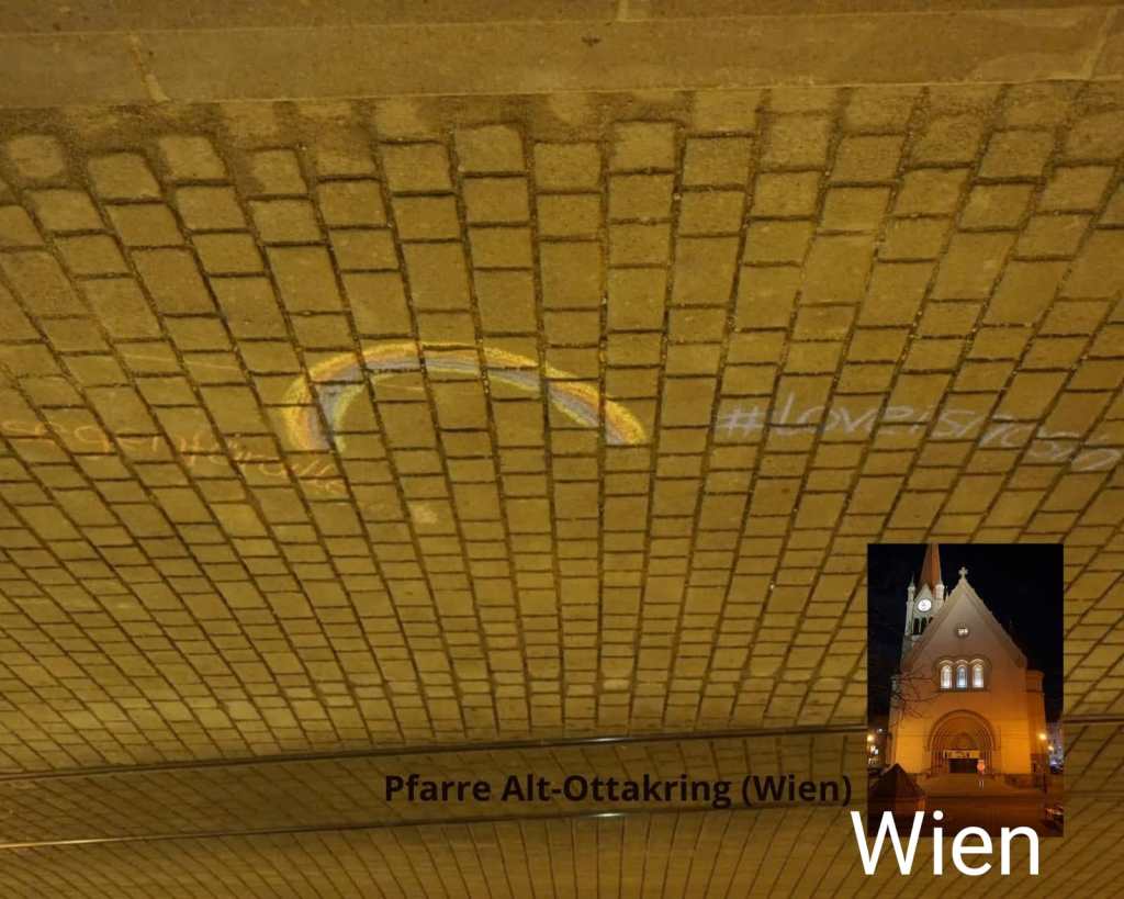 An 19 Orten in Österreich und Deutschland erschienen in der Nacht auf Sonntag strahlende Regenbögen vor den Kirchen und auf öffentlichen Plätzen. Passend zum Palmsonntag breiten wir einen bunten Teppich vor den Eingängen aus, um mit Kreide ein Zeichen des Willkommens zu demonstrieren.